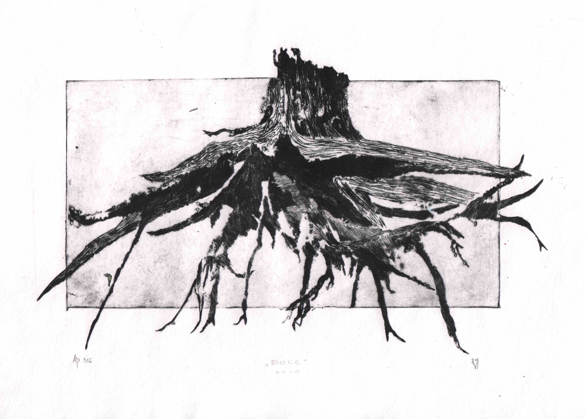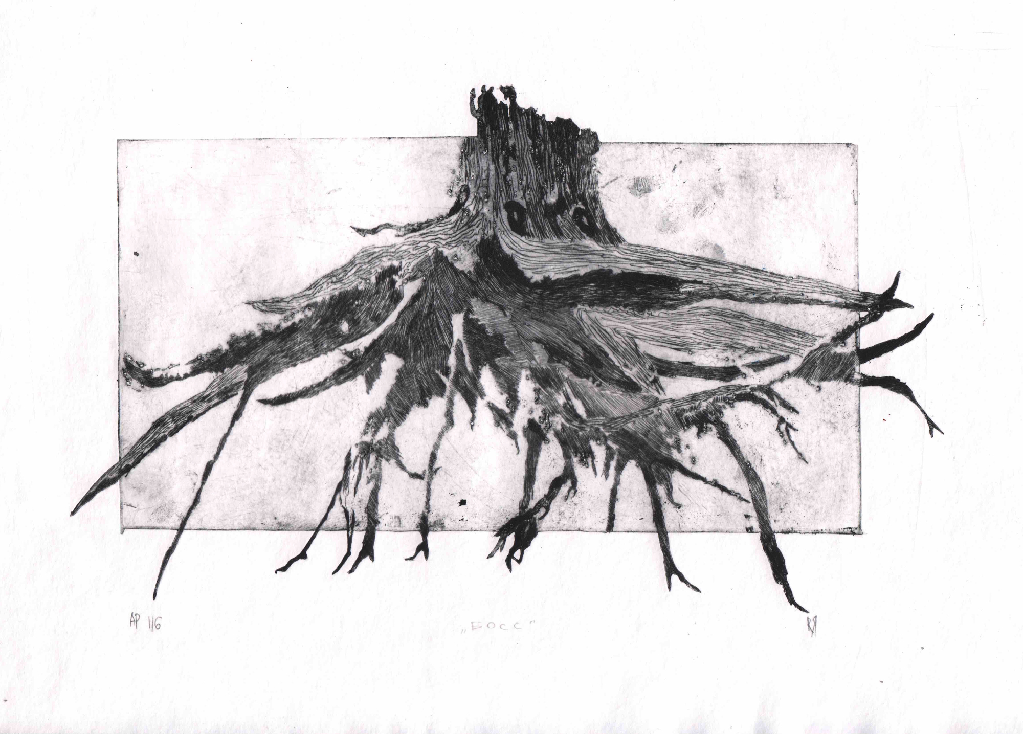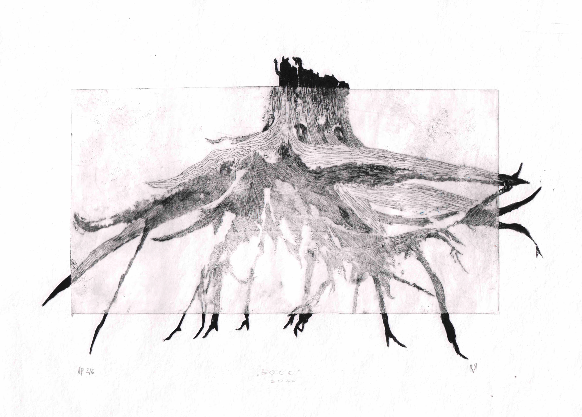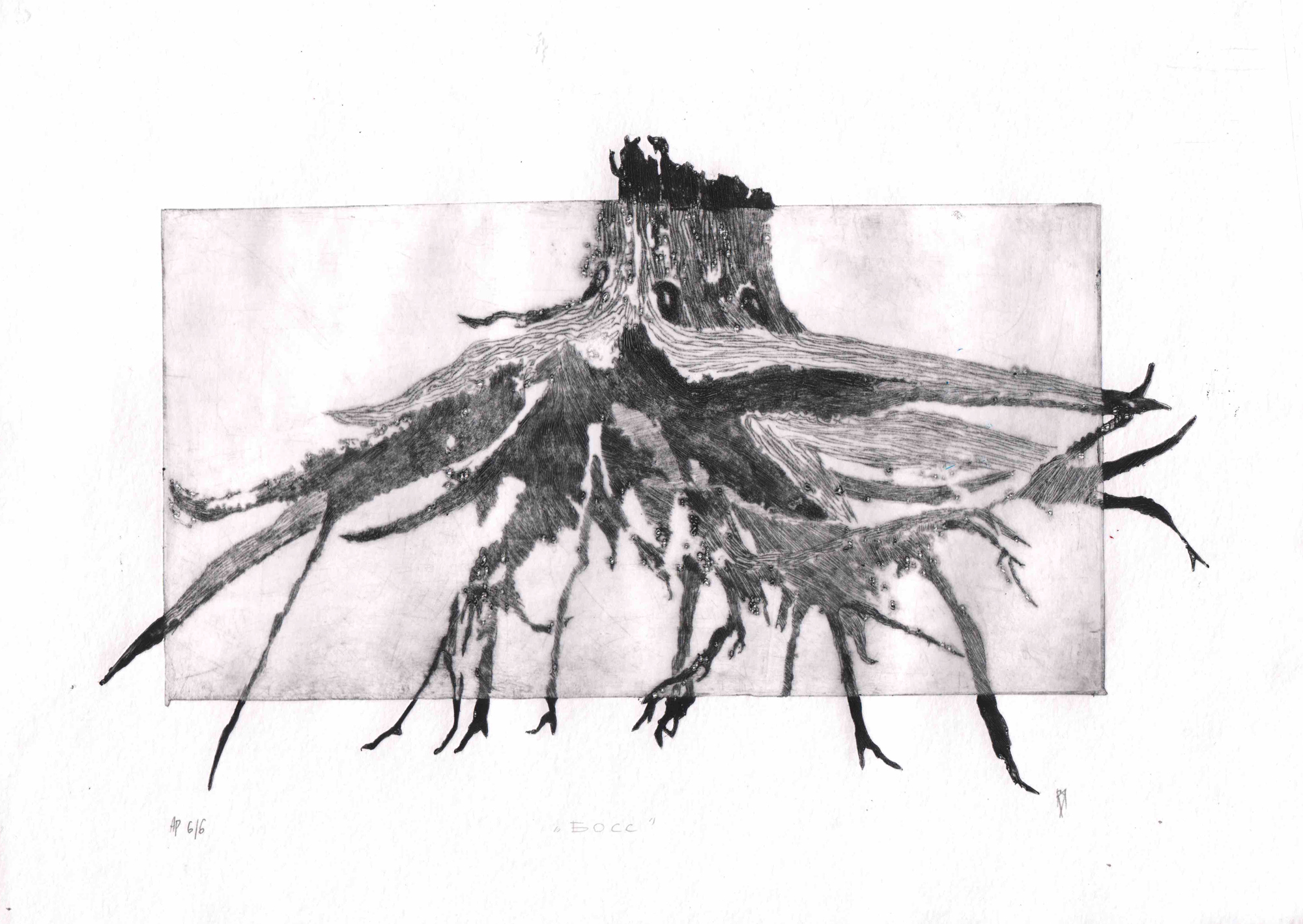 Графика Юлии Каревой была вдохновлена ее летним отдыхом на водохранилище. Художница наблюдала удивительное явление: из-под старых пней разлившийся водоем вымыл всю почву, и только их мощные извилистые корни удерживали на месте остатки некогда могучего леса. Стоя на своих корнях на поверхности земли, старые пни выглядели как инопланетные захватчики.