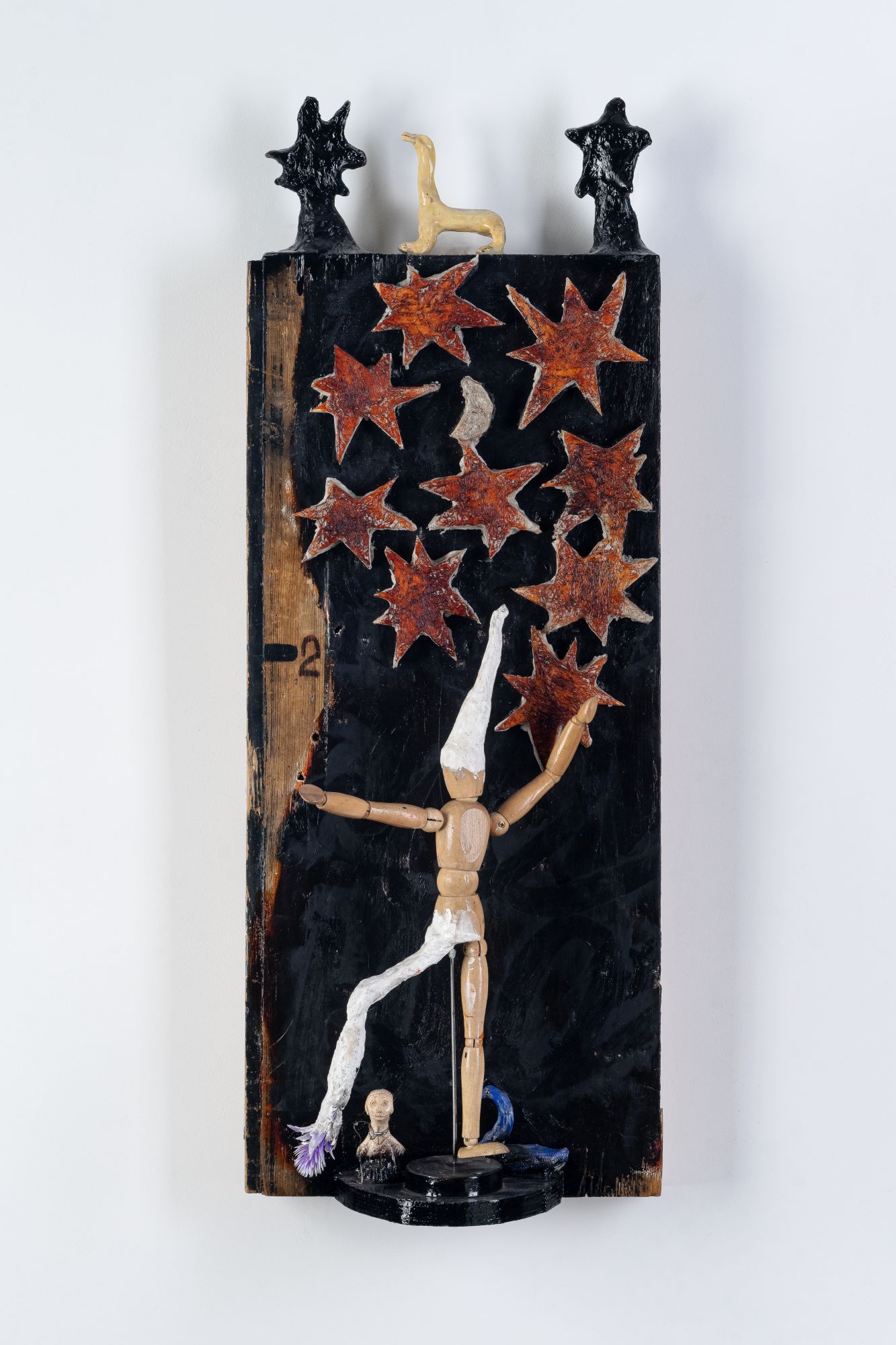 Материалы: Деревянный шкафчик, текстиль, папье-маше, глина, искусственные растения, гирлянда, кружева, проволока, игрушечные бегемоты, масло, акрил, сграффито