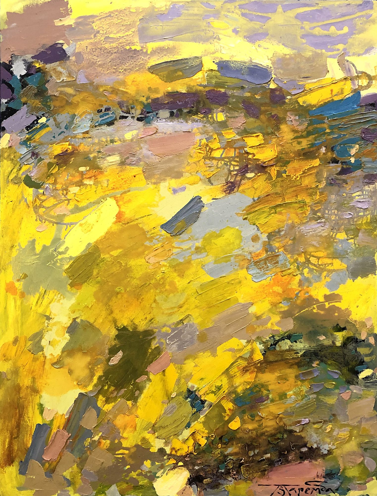 Polina prefers working in abstract expressionism genre, getting inspired from the real architectural ensembles and urban landscapes. Polina Zaremba as a painter is interested in colour. The triumph of colour is key to perceiving an abstract painting. It is a way from being timid in front of the power of colouristic decisions to the freedom of colour expressions, to an emotional splash. This kind of painting does not present the reality the way it is, it supposes an active work of an aesthetic perception, of the artistic mind of a viewer. A work must be vivid, filled, exposed, moving, vibrant like a living being; it must emanate the warmth of a living body even if on the outside it is very calm.