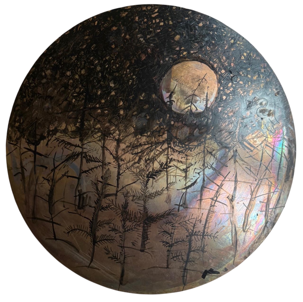 Форма круга для меня довольно частая. Это и глазок объектива, и тарелка, как объект рисования, это и круглые зеркала. В серии «пейзажи на меди» я как бы делаю оммаж старинной китайской миниатюре, которая часто помещалась в круг. Пейзажи вымышленные, придуманные. Мне хотелось использовать металл, как часто изменяющийся под воздействием света. Как и в природе, небо меняется быстро в зависимости от освещения, так и в медных кругах, пейзаж может поменяться в течении дня.