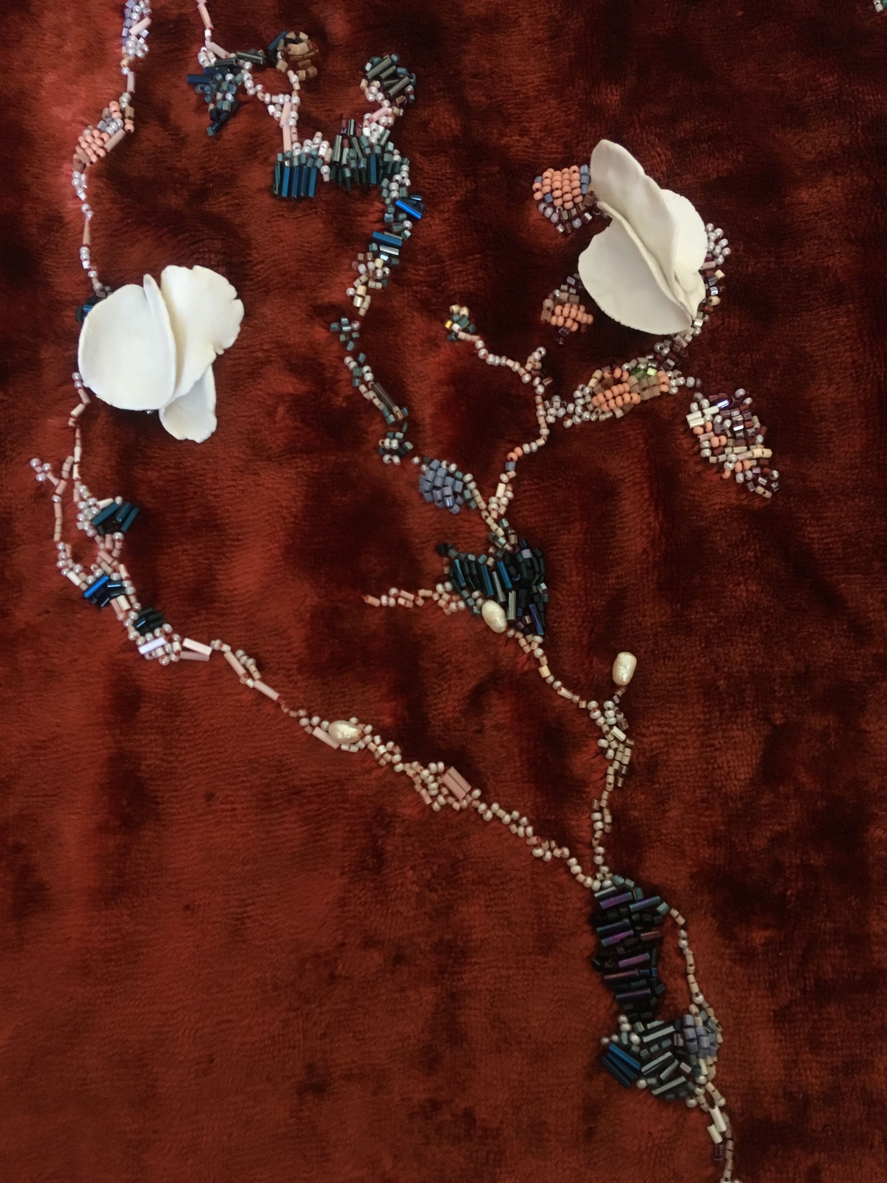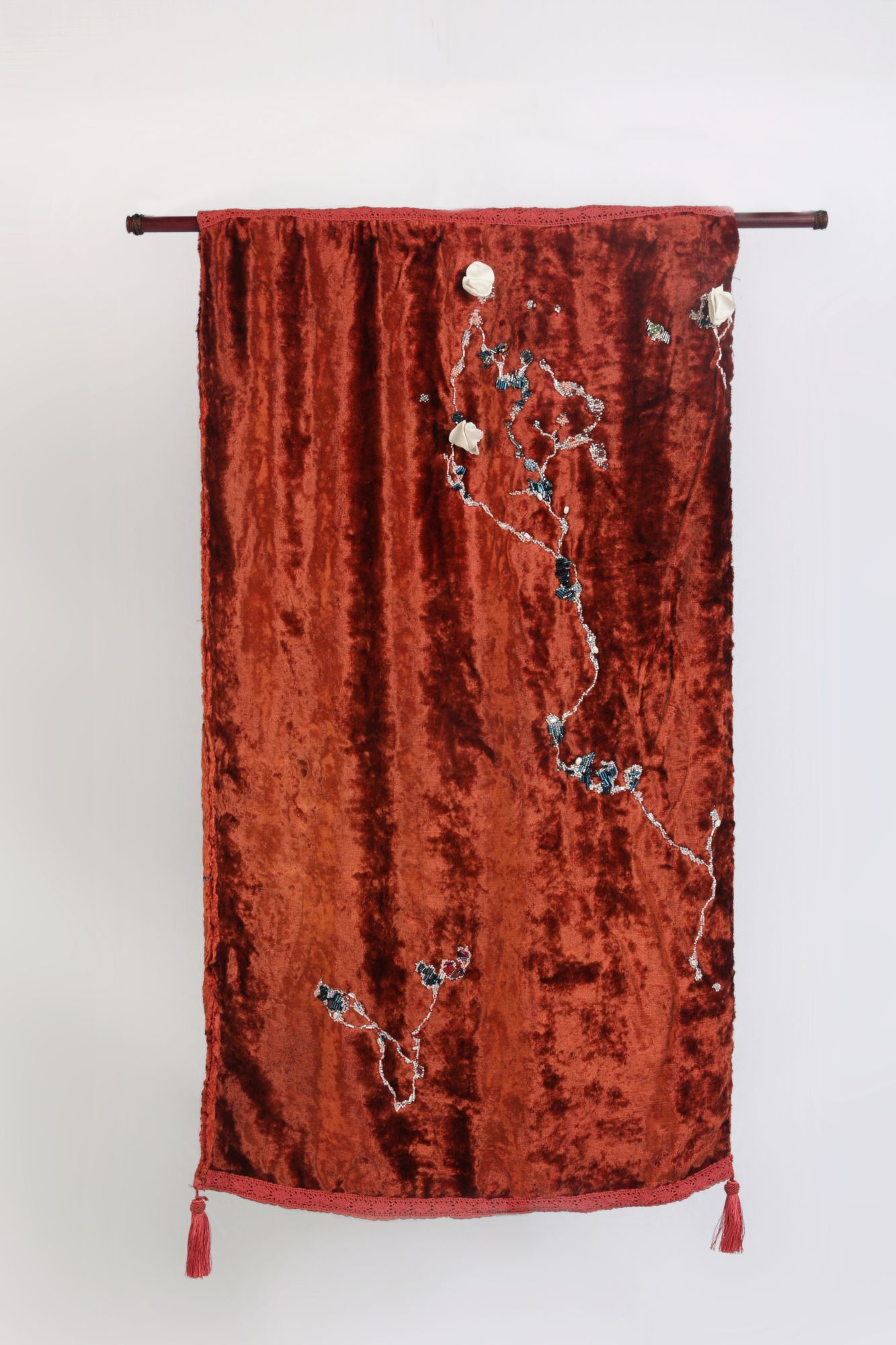 Основой для работ Дарья выбрала старинный бархат, на котором заметен отпечаток прошлого. Они – маркеры времени и годовые кольца ткани. Художница видит в этом их живую природу, нечто настоящее, что она всегда стремится вывести на передний план в своих работах. Для этого Дарья использует многочасовую, медитативную вышивку старинным жемчугом, бисером и стеклярусом с добавлением лепных фарфоровых форм.