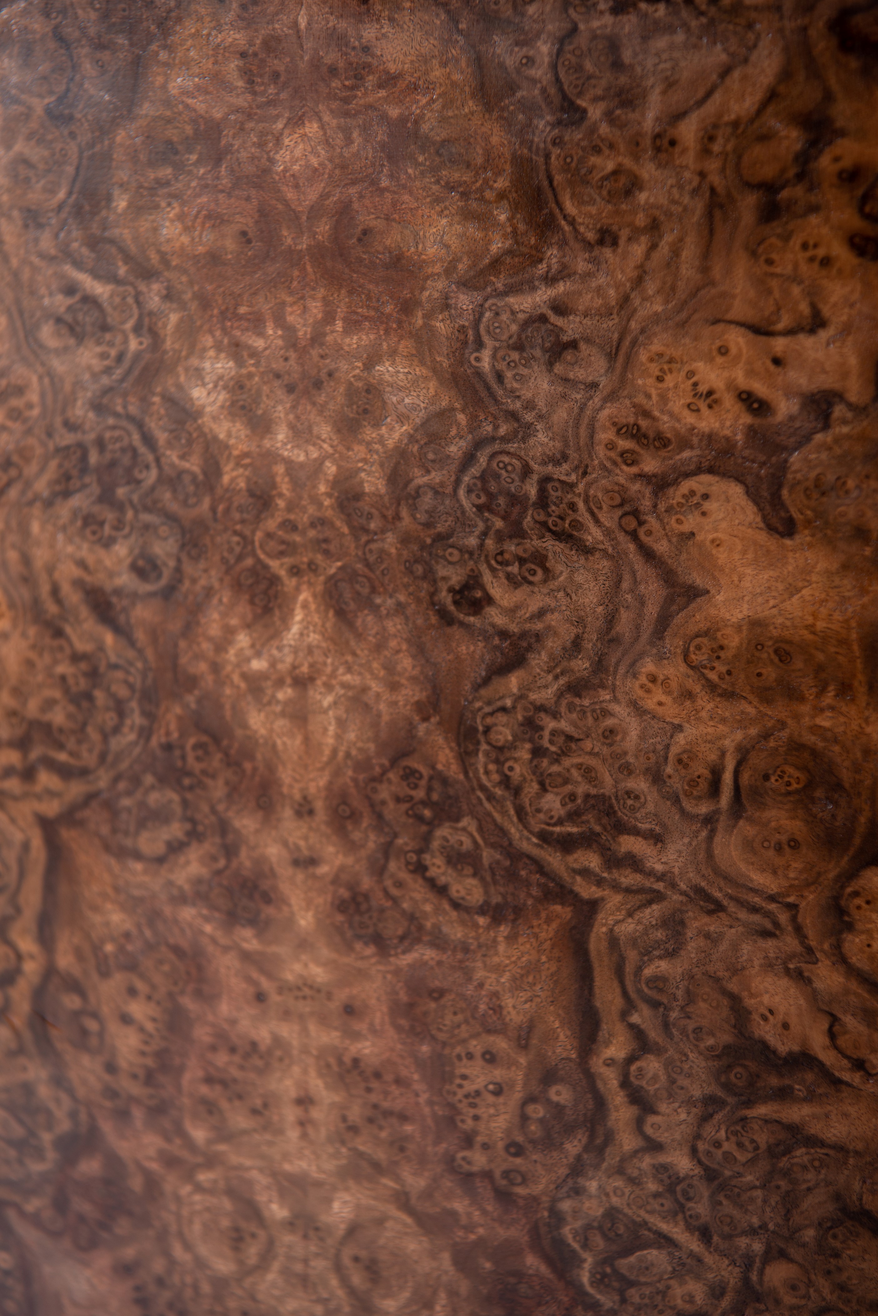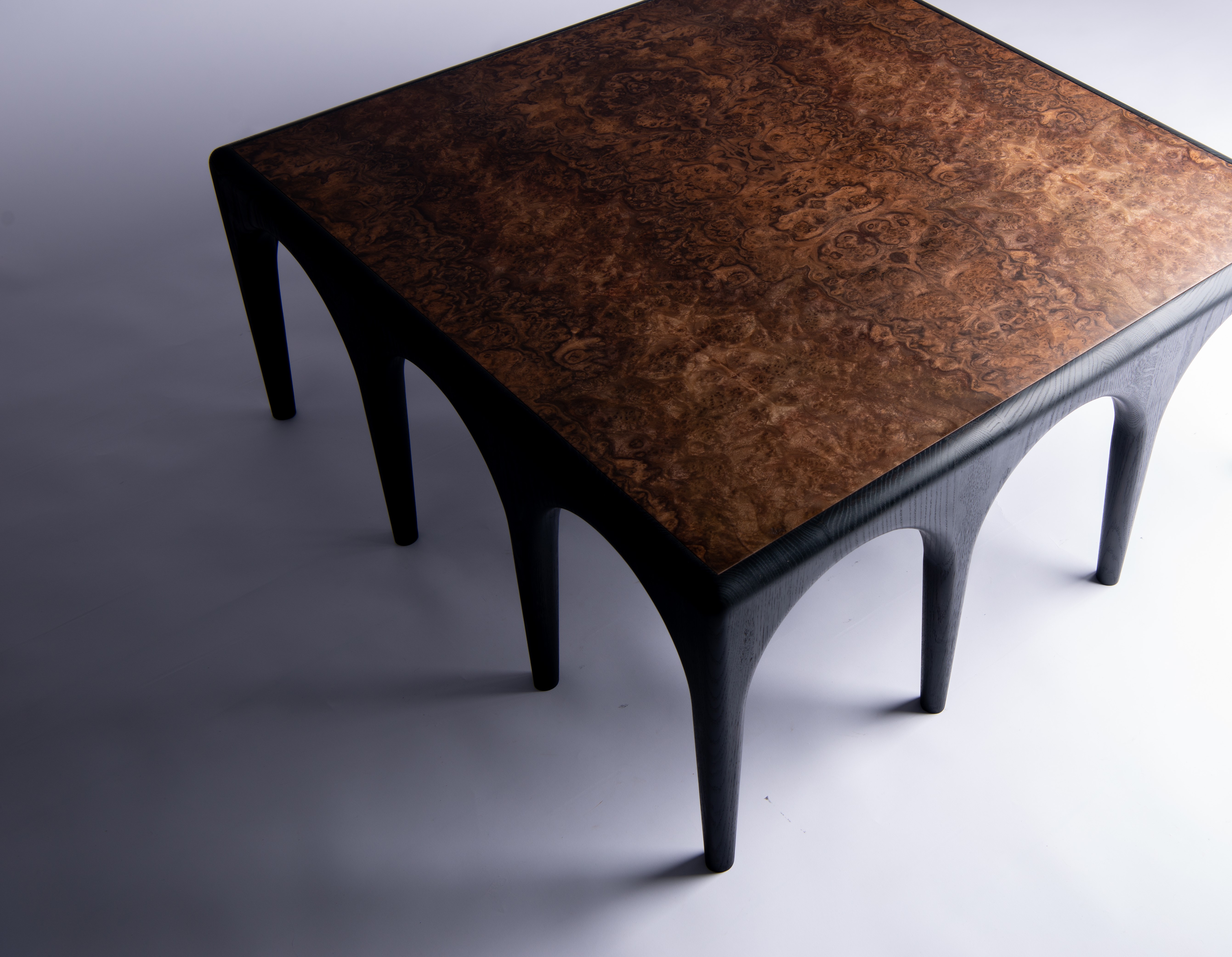 The contrast of the black base and the natural-colored tabletop is emphasized by the wood treatment (smooth base and textured top with deep brushing).
