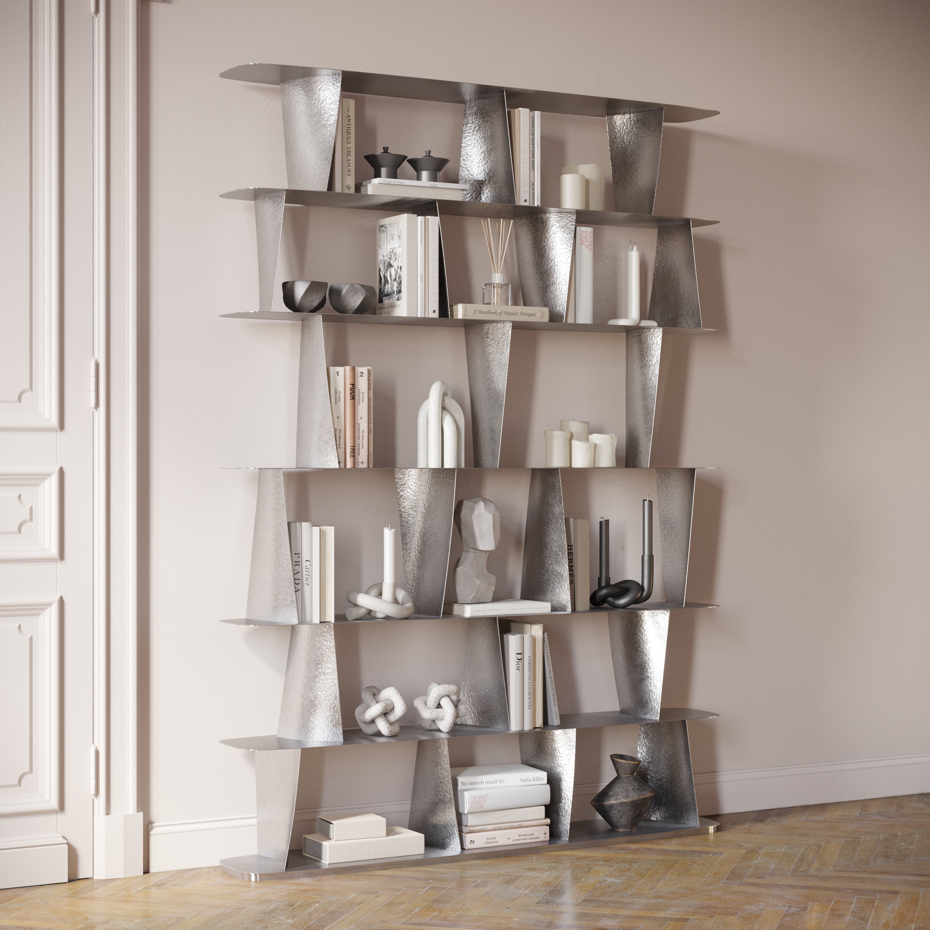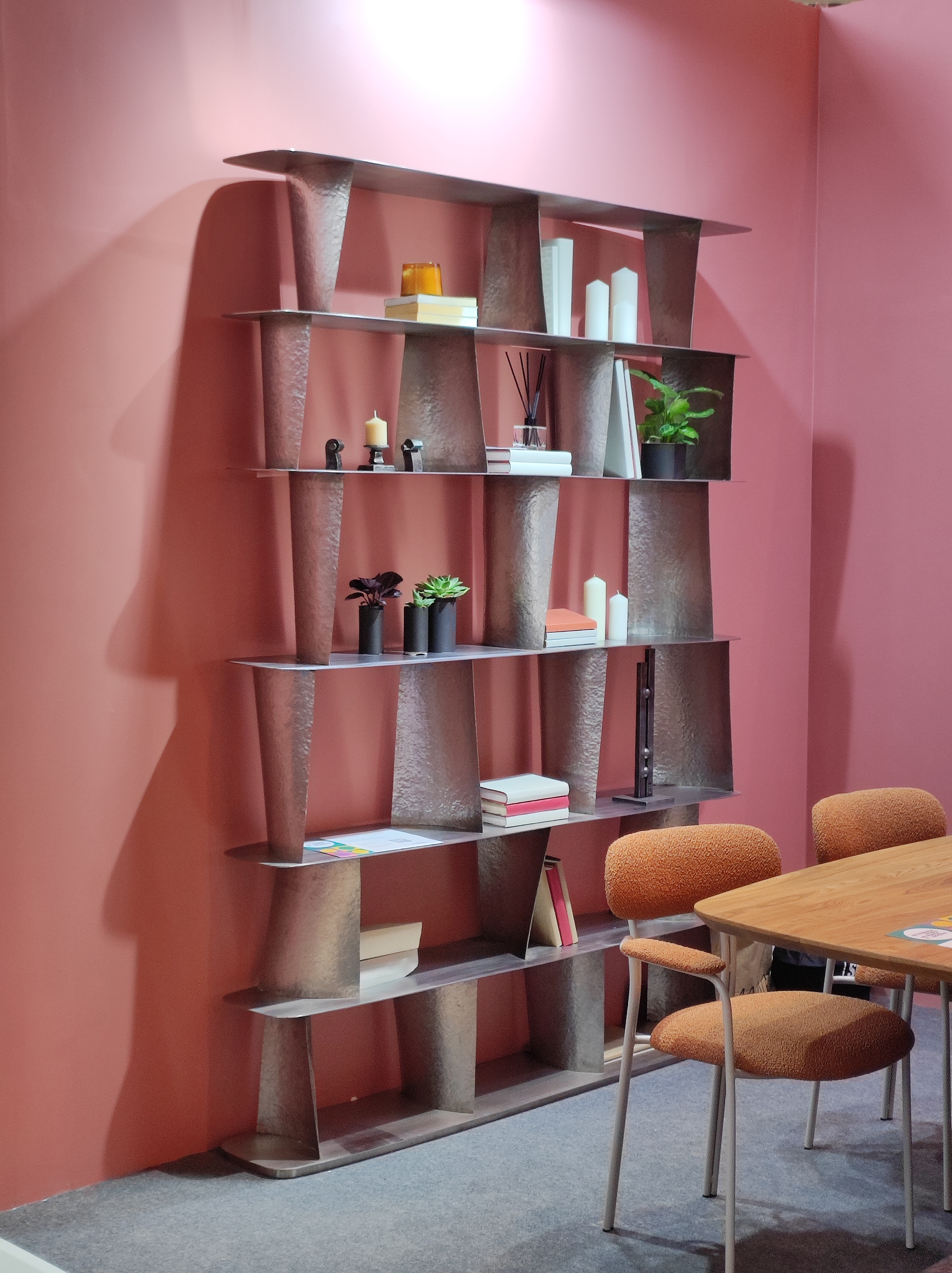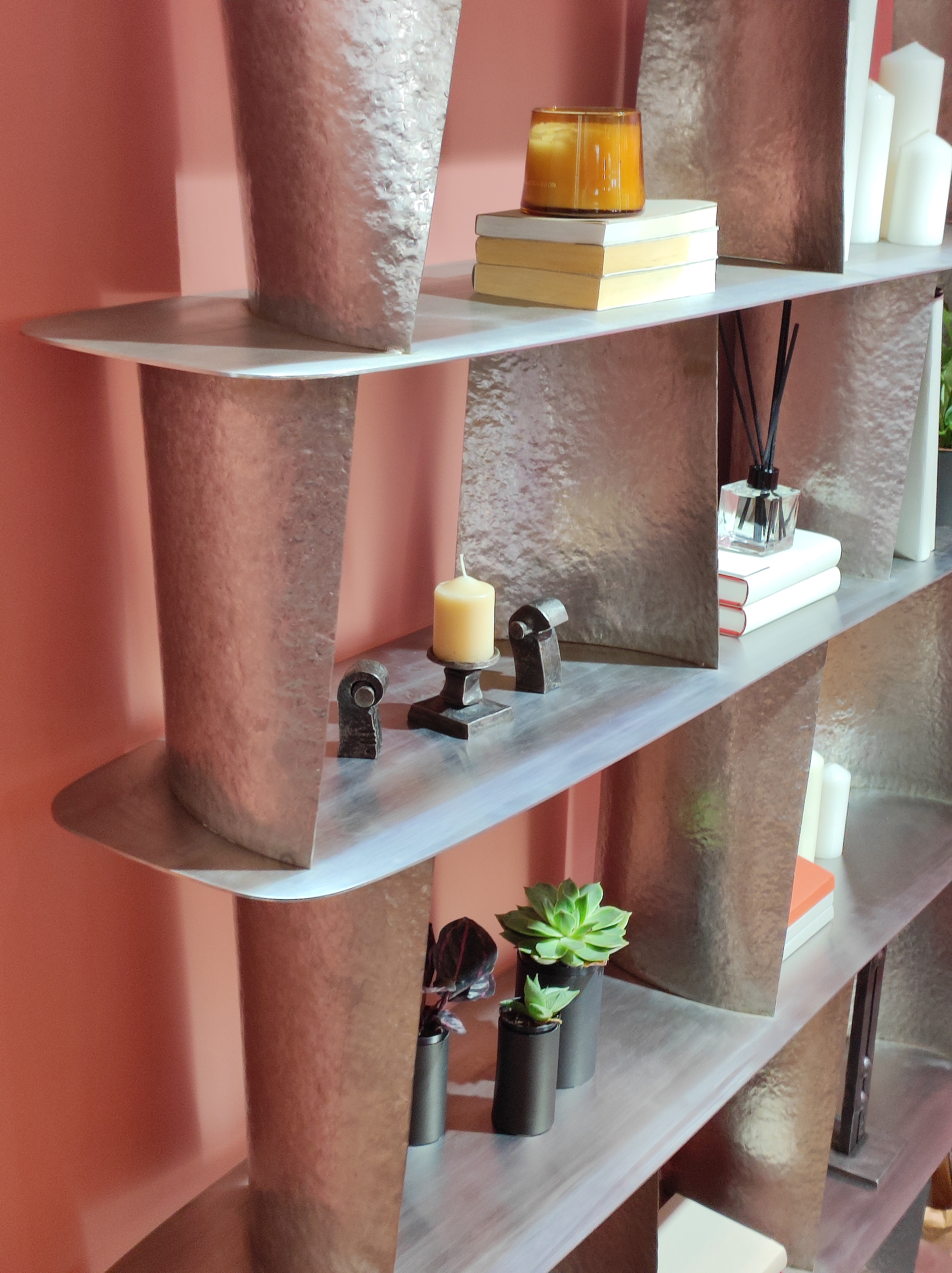 Стеллаж выполнен из нержавеющей стали. Цельная сварная конструкция состоит из сатинированных полок и выгнутых вертикалей, напоминающих лопатки авиадвигателей, которым придана фактура, нанесенная методом горячей ручной ковки.