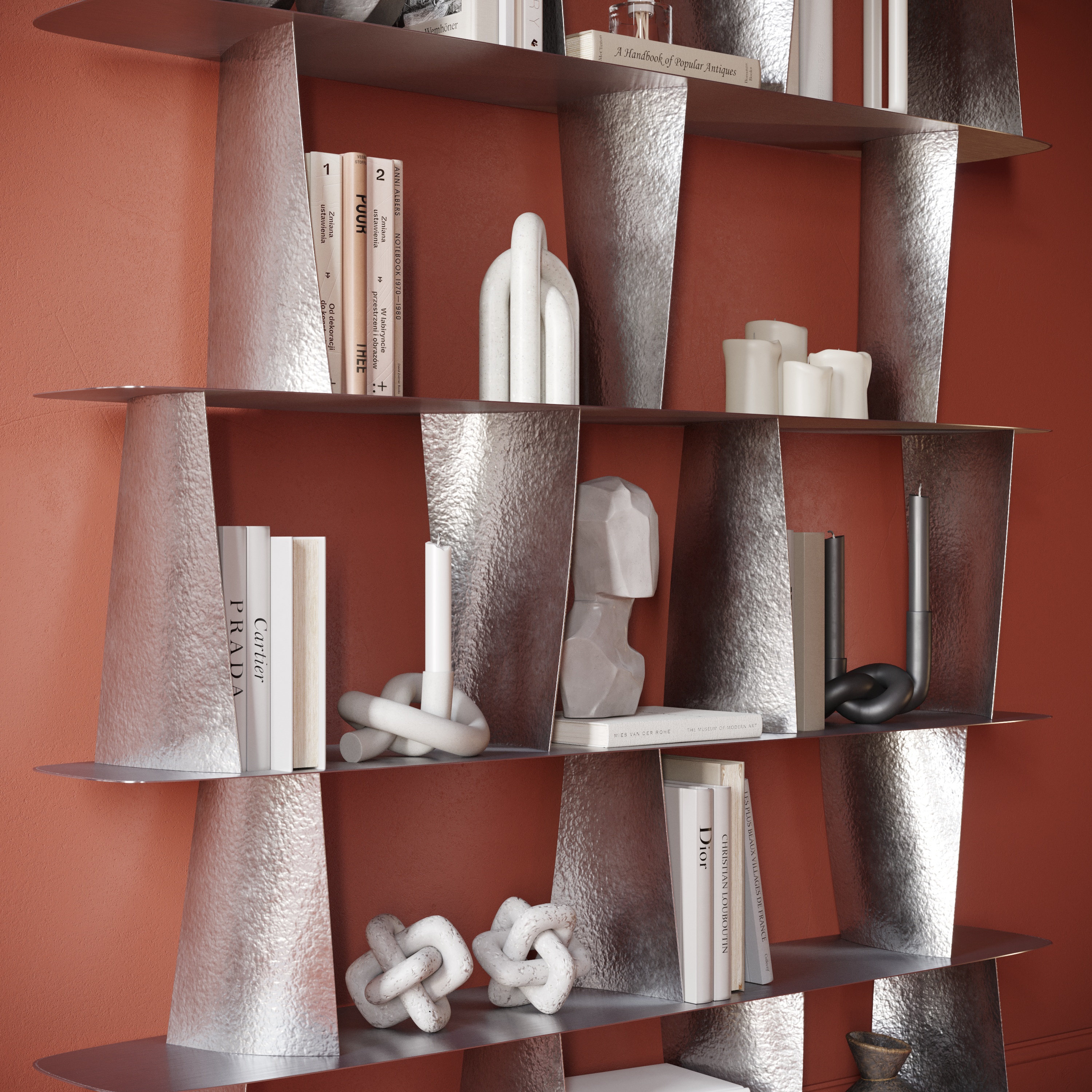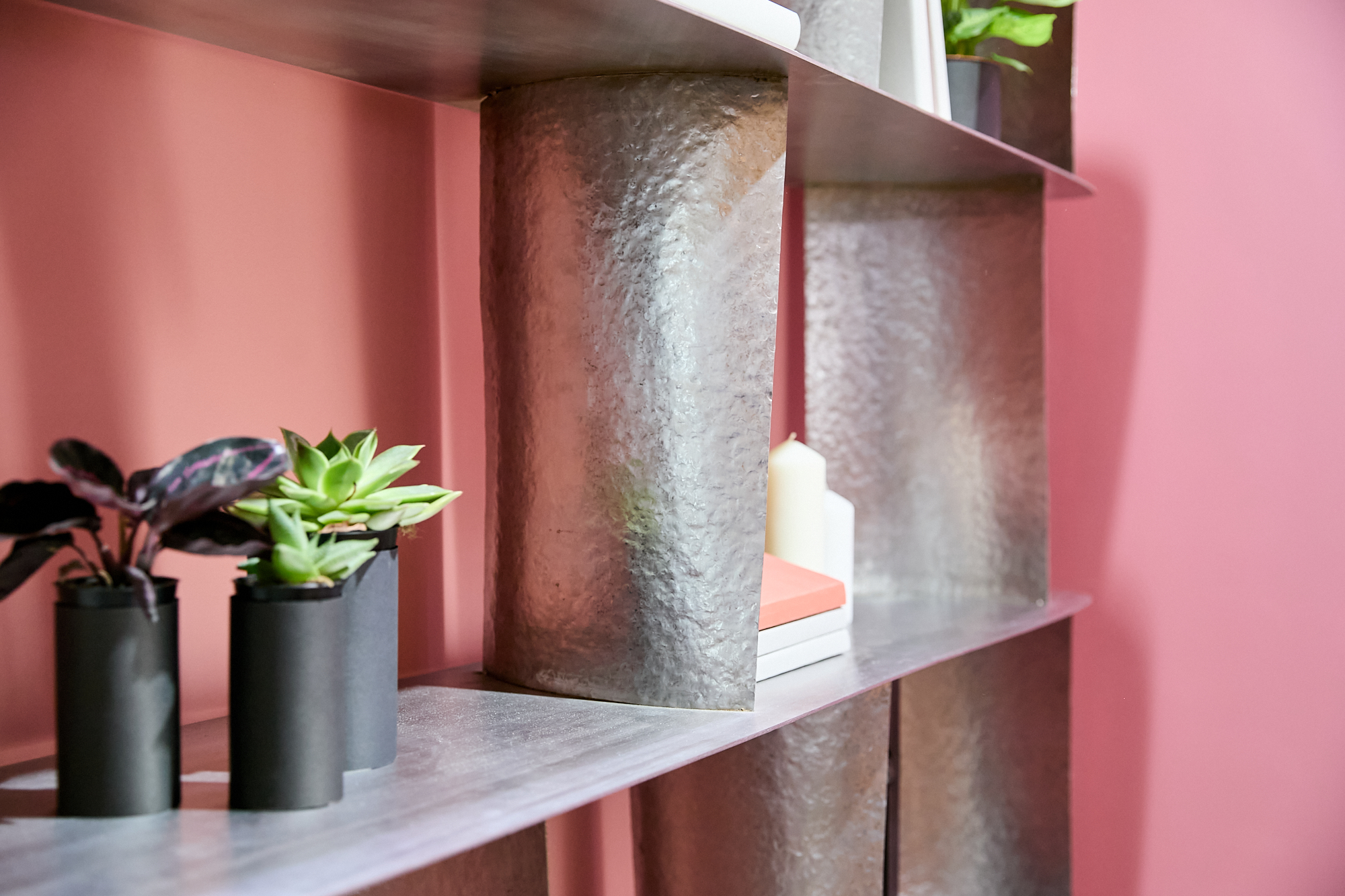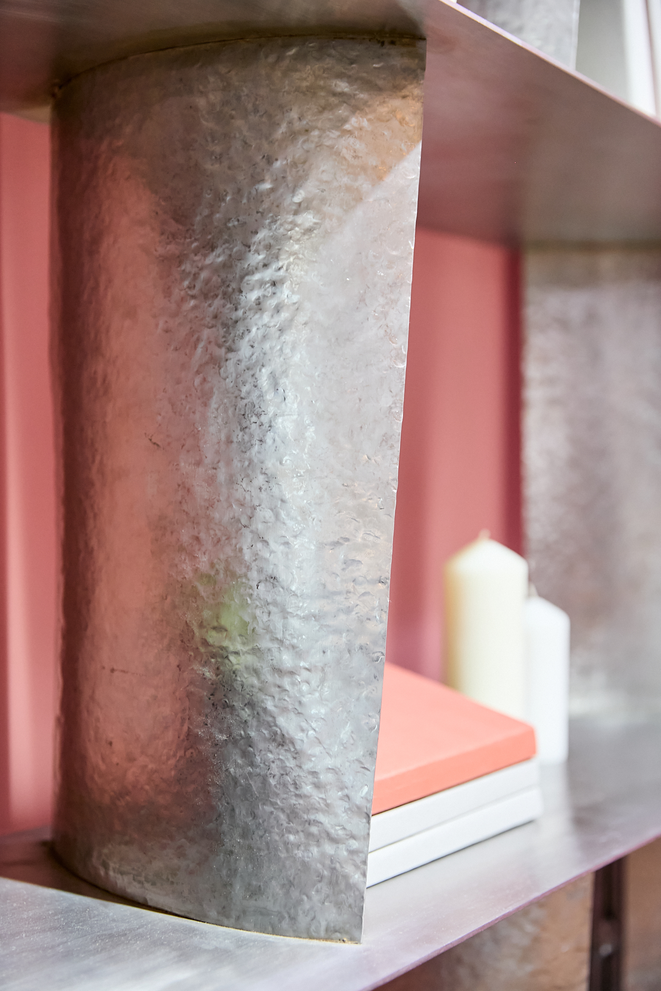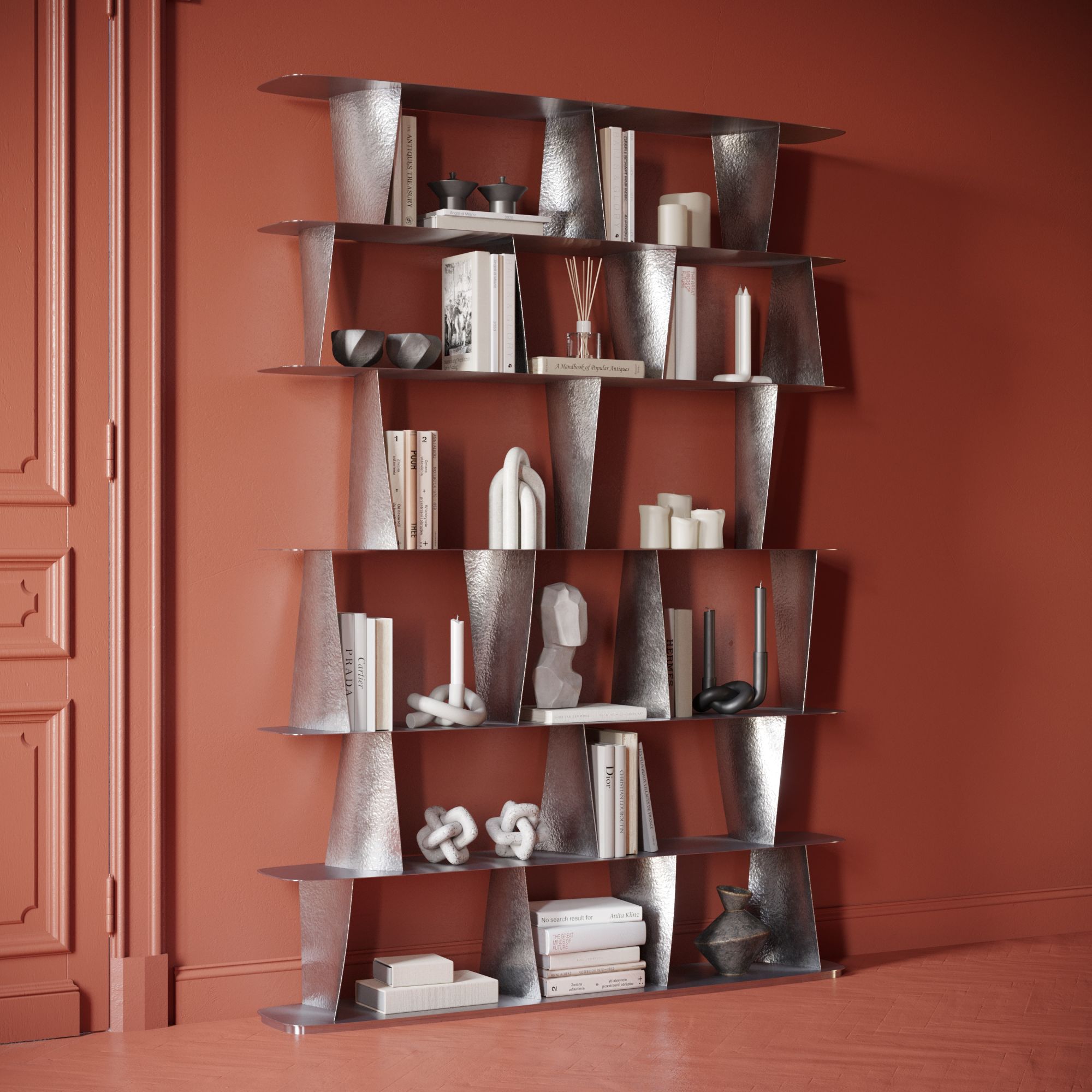 Стеллаж выполнен из нержавеющей стали. Цельная сварная конструкция состоит из сатинированных полок и выгнутых вертикалей, напоминающих лопатки авиадвигателей, которым придана фактура, нанесенная методом горячей ручной ковки.