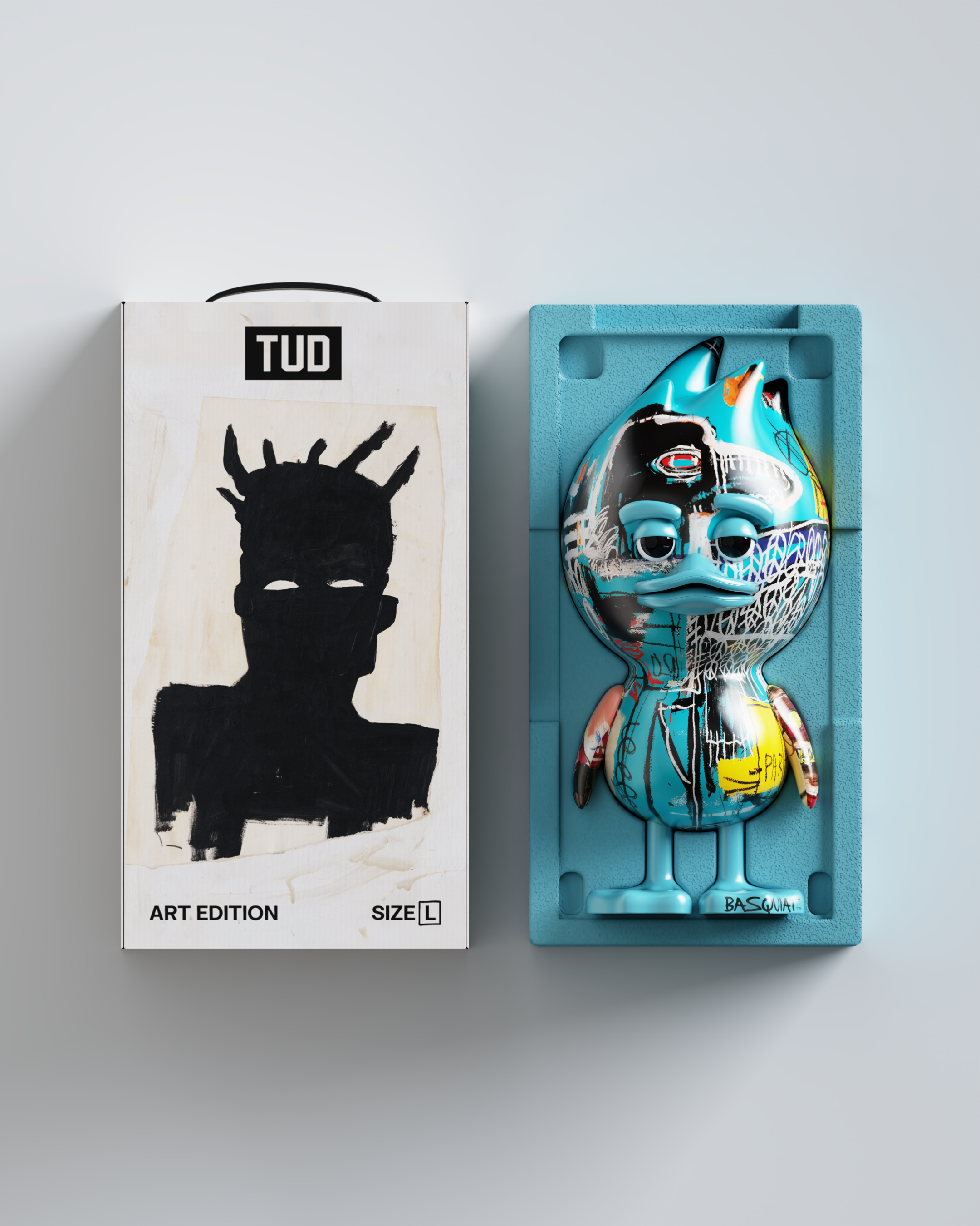 Оба TUD вдохновлены работами Баския и исполнены в его фирменных ярких тонах. Излюбленный мастером синий оттенок, наряду с красным, черным и белым, повторяет текстуру холста — неровную, слегка шероховатую, — соответствуя грубому, аутентичному стилю художника.